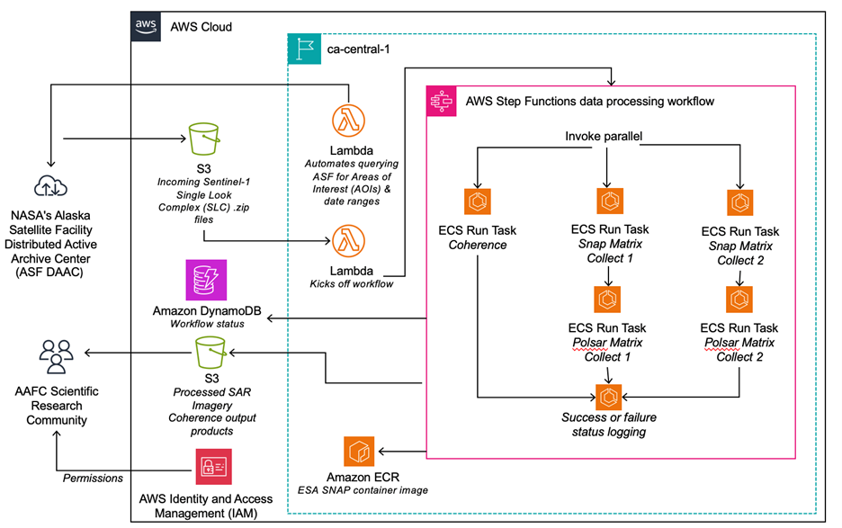 AAFC’s solution uses containerized scientific applications, event-driven automation, and managed compute services to orchestrate the workflow from data ingestion to product generation.
