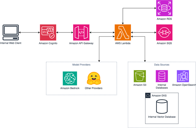 - Orchestration layer – Serverless framework built on Amazon API Gateway and AWS Lambda that abstracts model management, prompt templating, data retrieval, and security behind a single API and UI