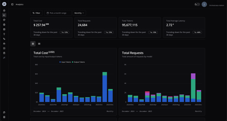 Figure 2. Real-time analytics dashboard providing full visibility into token usage, costs, and latency across all model usage