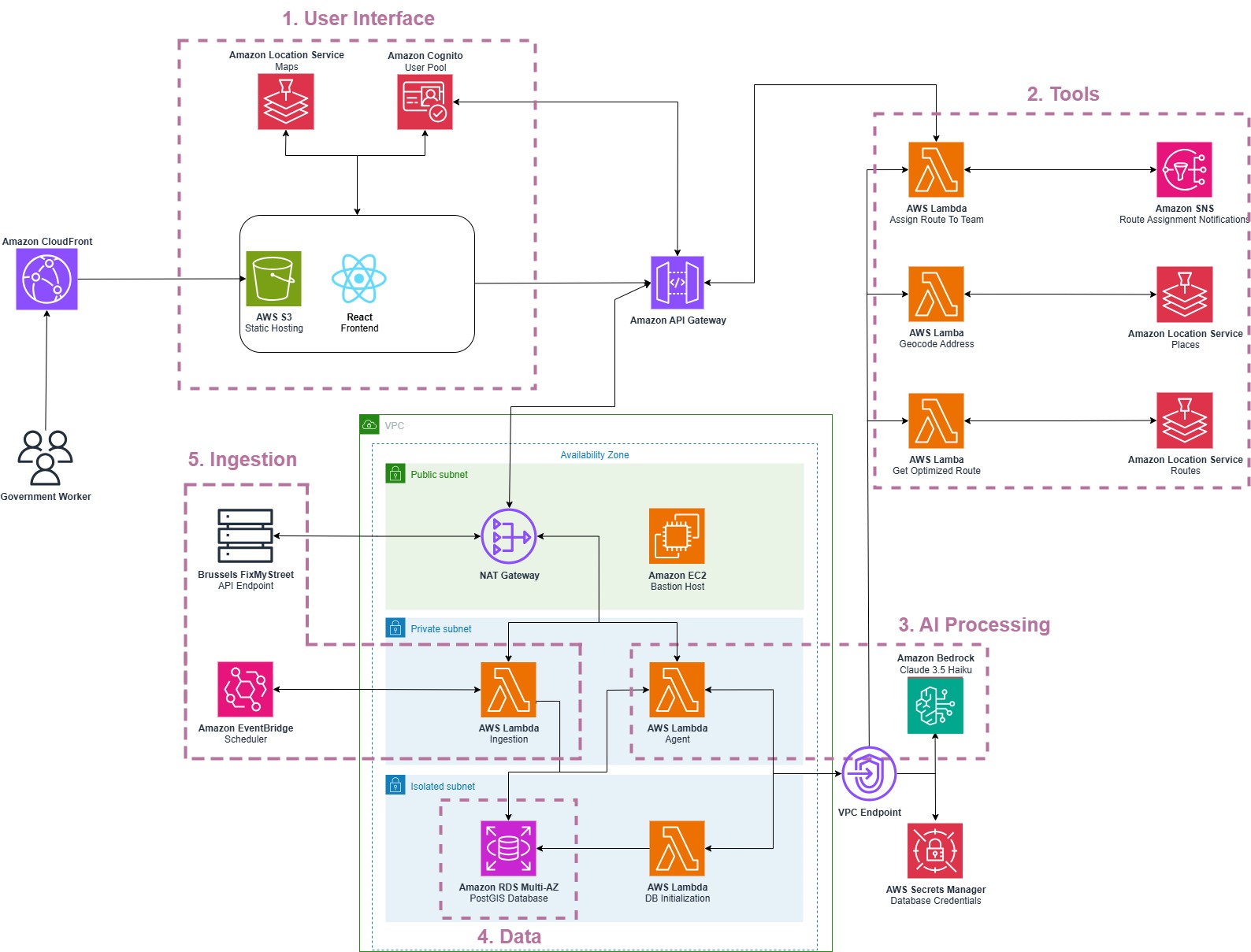 This post explores how AI agents powered by Strands Agents on Amazon Web Services (AWS) can transform geospatial workflows, making spatial data accessible to any government worker through natural language interactions. We’ll examine the technical architecture, implementation details, and demonstrate the approach using Brussels’ FixMyStreet open data API, an open data API available for the city of Brussels, which provides real-time nonemergency incident reports including graffiti, road maintenance, and public infrastructure repairs across the city.