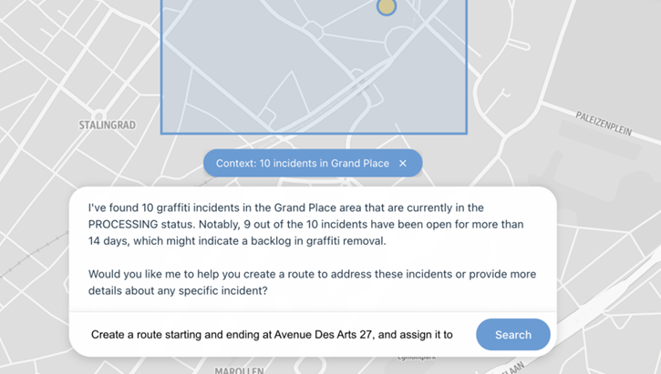 Agent response: “I’ve found 10 graffiti incidents in the Grand Place area that are currently in the PROCESSING status. Notably, 9 out of the 10 incidents have been open for more than 14 days, which might indicate a backlog in graffiti removal. Would you like me to help you create a route to address these incidents or provide more details about any specific incident?”