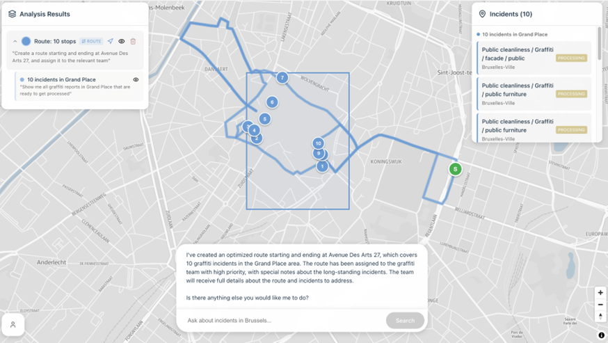 Agent Response: “I’ve created an optimized route starting and ending at Avenue Des Arts 27, which covers 10 graffiti incidents in the Grand Place area. The route has been assigned to the graffiti team with high priority, with special notes about the long-standing incidents. The team will receive full details about the route and incidents to address. Is there anything else you would like me to do?”