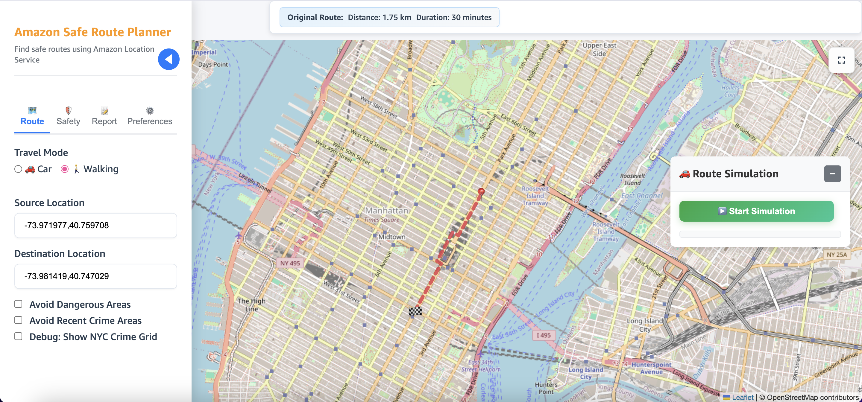 - Configurable avoidance – Users can choose to avoid recent crimes by applying a 100–500-meter buffer, which the system incorporates into routing decisions.