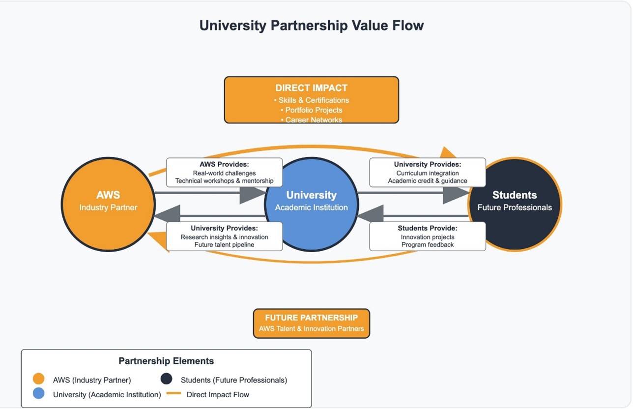 These collaborations create meaningful value for everyone involved. Students gain practical skills, industry exposure, portfolio projects, and professional networks that strengthen their career readiness. Faculty benefit from current industry insights they can integrate into their teaching, curriculum development opportunities, and professional connections that keep them engaged with evolving industry practices. Universities strengthen industry relationships, enhance program offerings, and improve student outcomes that demonstrate their commitment to practical, career-focused education. AWS gains the opportunity to contribute meaningfully to the educational institutions that shape the next generation of builders while building relationships with emerging talent and gaining insights that inform our product development and educational resource creation.