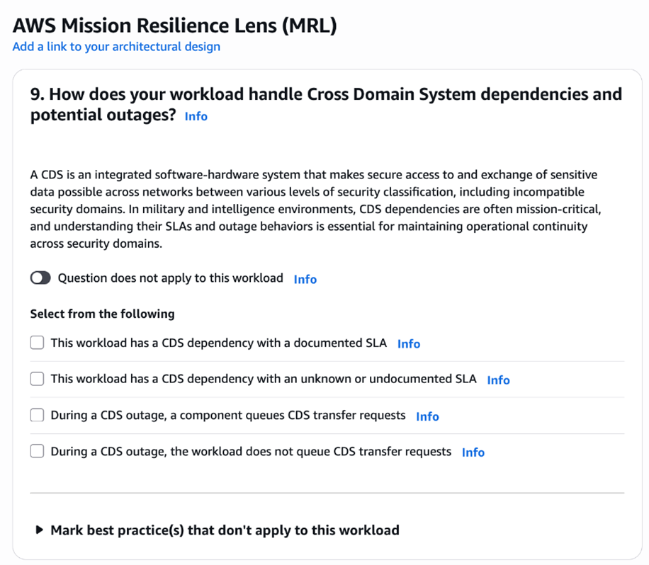 To illustrate how the lens addresses these critical areas, let’s examine one of its key recommendations. For defense workloads operating across multiple security domains, cross-domain solution (CDS) dependencies are often mission-critical. The lens provides specific guidance on validating workload behavior during CDS disruptions, including implementing data queuing mechanisms, testing alternative data transfer paths, and documenting degraded operation procedures. This systematic approach helps verify that workloads can maintain essential functions even when cross-domain data transfer capabilities are impaired, a critical consideration for maintaining operational effectiveness in contested environments. The following screenshot shows an MRL question detailing CDS topics in the AWS Well-Architected Tool.
