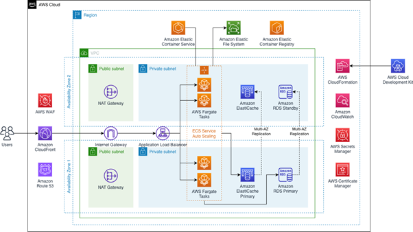 The solution is deployed using AWS Cloud Development Kit (AWS CDK), which allows users to define cloud application resources using familiar programming languages. The solution is deployed using two Availability Zones (AZs) for high-availability.