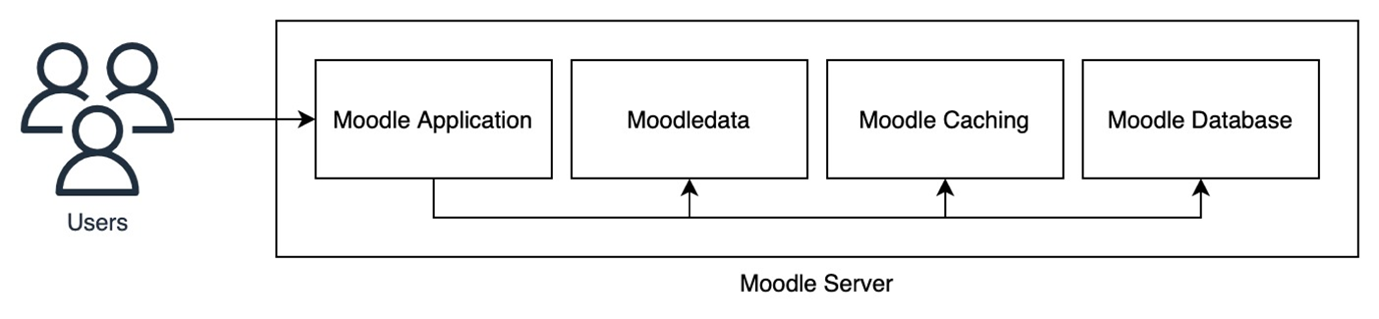 Moodle itself is a monolithic application developed using PHP, with the database typically using MariaDB, MySQL or PostgreSQL. By default, Moodle stores its application data within the database and files in a directory called moodledata. To improve performance, Moodle also supports caching services such as Valkey, Redis or Memcached.