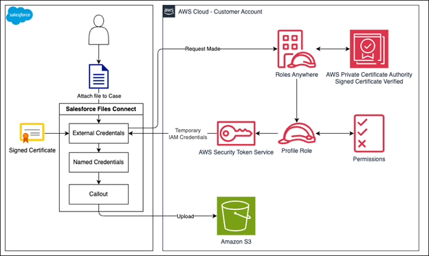 This section provides detailed, step-by-step instructions for implementing the Amazon S3 and Salesforce PSS integration. We use Amazon Web Services (AWS) Identity and Access Management Roles Anywhere (IAM Roles Anywhere) for certificate‑based authentication, which provides enhanced security over traditional access keys through short-lived credentials and automatic rotation.