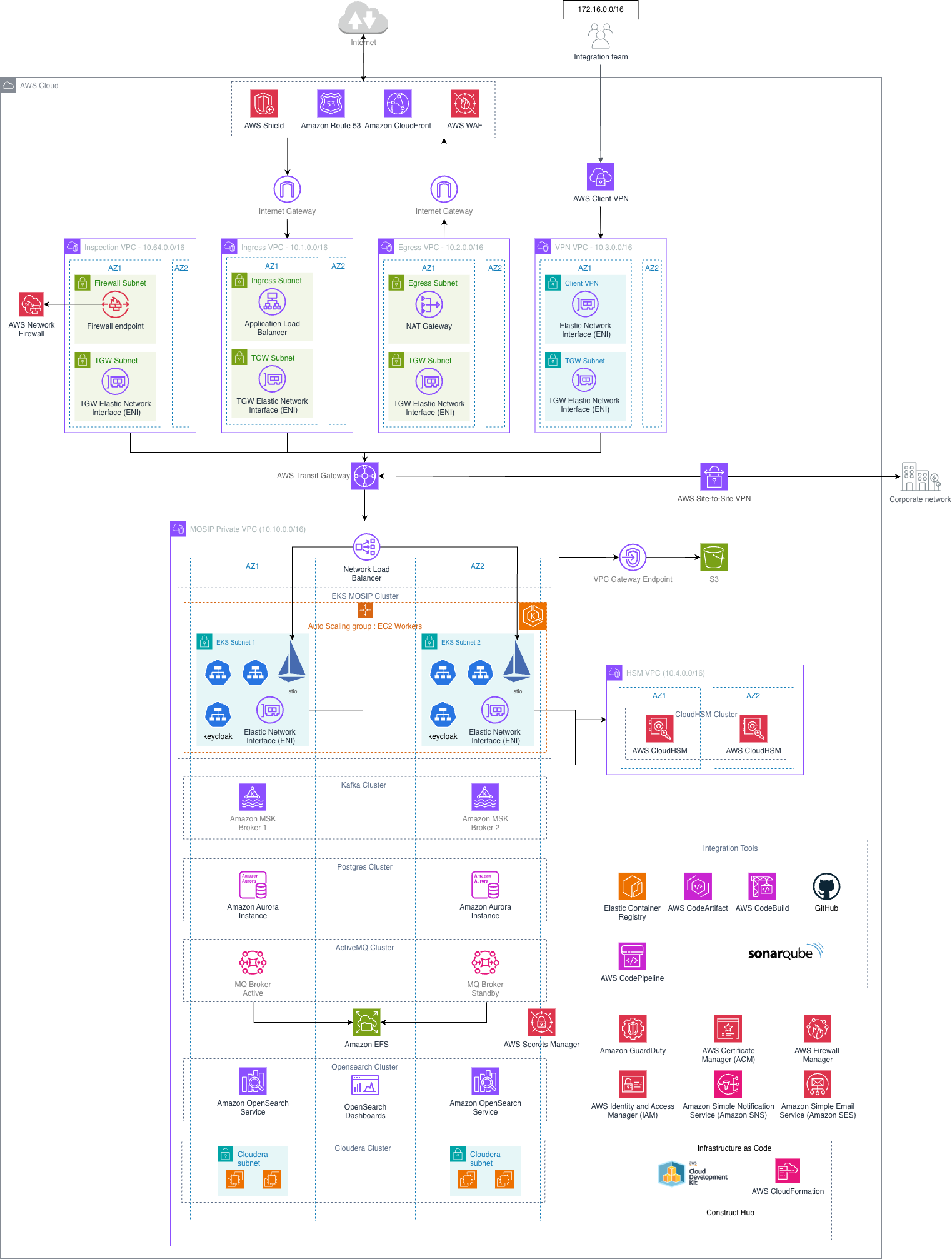 The MOSIP cloud architecture on AWS is designed with security and scalability at its core. The system’s entry points are protected by AWS Shield, Amazon Route 53, Amazon CloudFront, and AWS WAF, providing multi-layered security against security threats. The network architecture is segmented into specialized virtual private clouds (VPCs) (transaction, ingress, egress, and VPN) interconnected through an AWS Transit Gateway, to help enable secure communication flows.