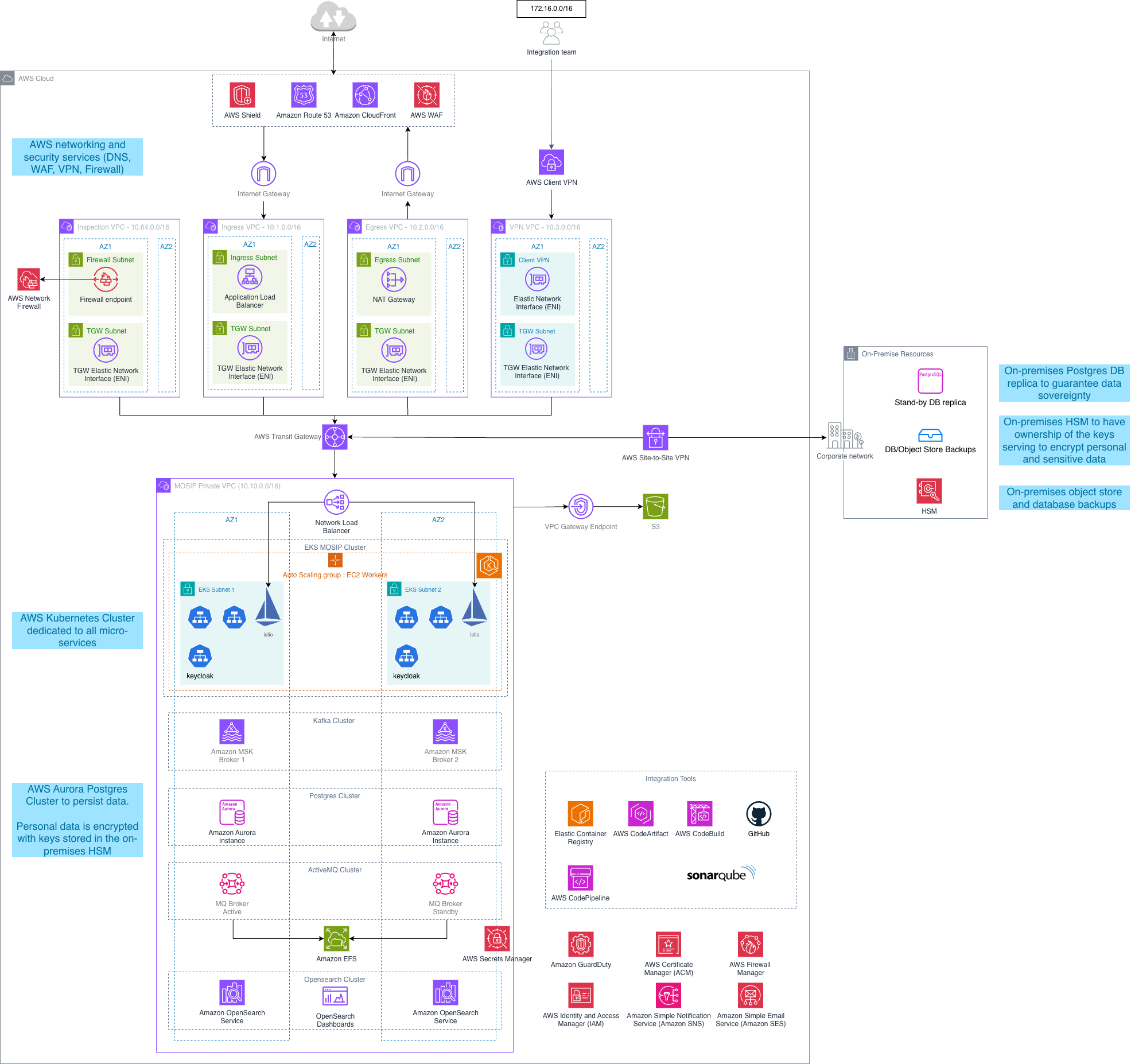 At the heart of the system lies the MOSIP Private VPC, hosting an Amazon EKS cluster distributed across two Availability Zones for high availability. This cluster runs the core MOSIP services, supported by essential managed services including Amazon Kafka for event streaming, Amazon Aurora PostgreSQL for data persistence, Amazon MQ for message queuing, and Amazon OpenSearch for analytics.