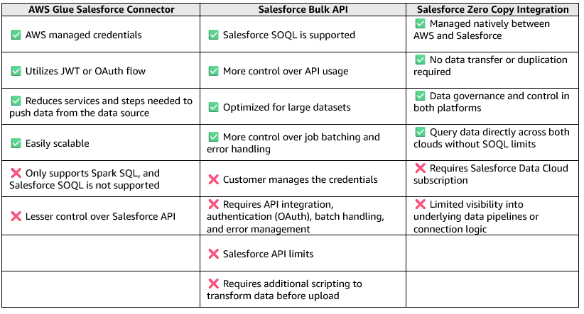 Recently, Salesforce and AWS introduced a third approach, Zero Copy ETL, which eliminates the need for traditional ETL or bulk upload processes altogether. This approach enables Salesforce Data Cloud and AWS storage services such as S3 to share and access the same datasets. While the AWS Glue connector offers ease of use within AWS Glue ETL pipelines and the Bulk API offers flexibility for developers managing high-volume data operations, the Zero Copy Integration focuses on seamless data access between platforms. The choice depends on the specific use case: AWS Glue is preferable for AWS based workflows, Bulk API is better for large-scale, independent Salesforce data operations, and Zero Copy Integration for real-time cross-cloud analytics and AI enablement. These factors are listed in the following tables.
