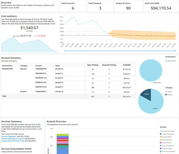This solution collects data from over 20 AWS services, delivering comprehensive cloud infrastructure visibility to organizations. The solution aggregates security and compliance data from AWS Security Hub, AWS Config, Amazon GuardDuty, AWS Identity and Access Management (IAM), and AWS CloudTrail. These services track user activity, evaluate resource configurations, and provide threat detection across AWS accounts.