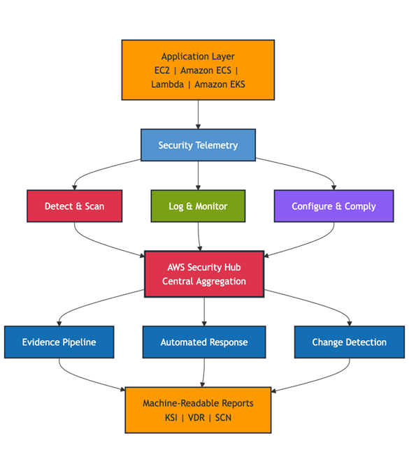 The following figure shows how AWS services work together to support FedRAMP 20x compliance. Your application feeds security data into three parallel processing tracks—detection and scanning, logging and monitoring, and configuration compliance. These tracks consolidate through AWS Security Hub, which then feeds automated evidence pipelines, response workflows, and change detection systems. The final outputs are machine-readable KSI, VDR, and SCN reports for your FedRAMP 20x authorization package.