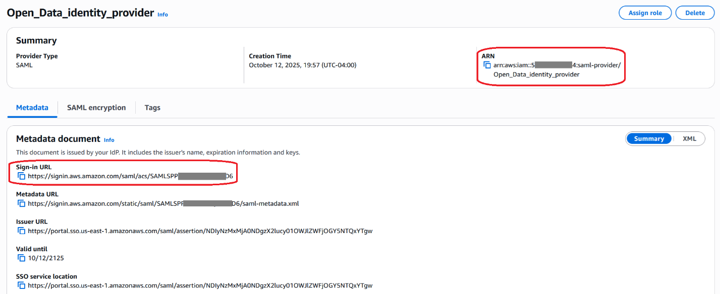 These provider attributes are required for configuring the attribute mappings in IAM Identity Center. You can find both attributes in the identity provider details page, as shown in the following screenshot.
