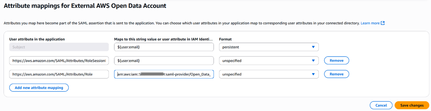 After configuring the SAML federation components in the external account, switch back to the AWS Organizations management account where IAM Identity Center is enabled. The next step is to configure attribute mappings that link the IAM Identity Center application to the IAM role created in the external account.