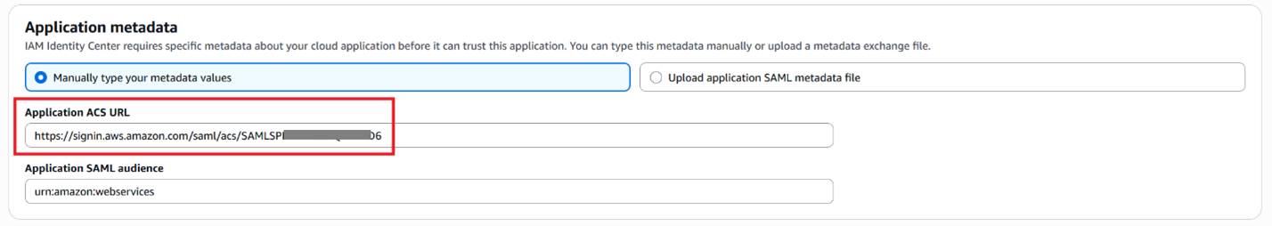 - In the Application metadata section, locate the Application ACS URL field and replace the default value with the sign-in URL noted in the “Creating the SAML identity provider in the external AWS account” section. This URL is crucial for establishing the correct endpoint for SAML assertions.