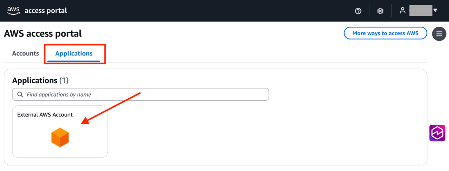 - Under the Applications tab, select the external AWS account application.The following screenshot shows the external AWS account application on the AWS access portal.