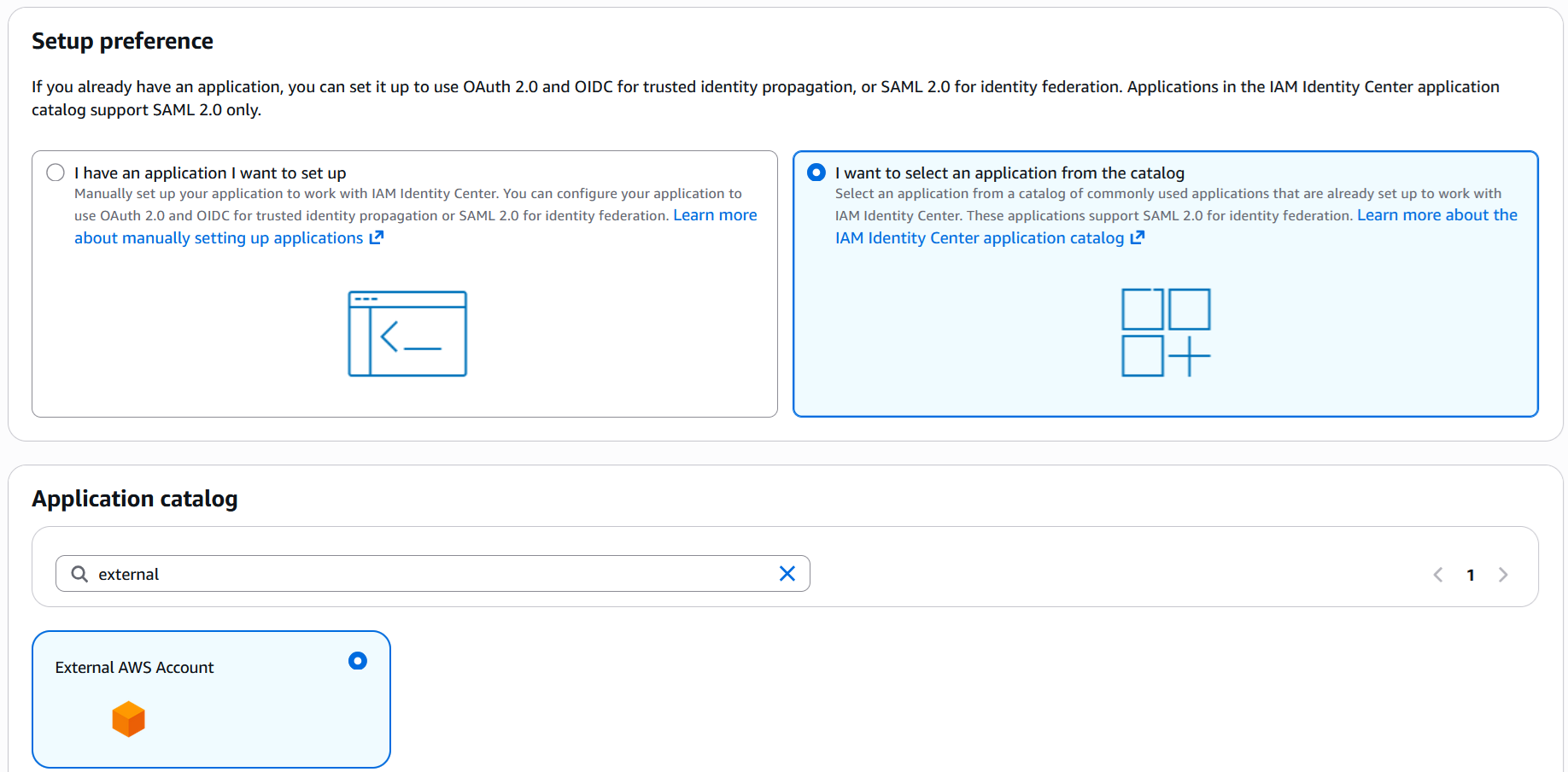 - In the Application catalog section, search and choose External AWS Account, as shown in the following screenshot. Choose Next.
