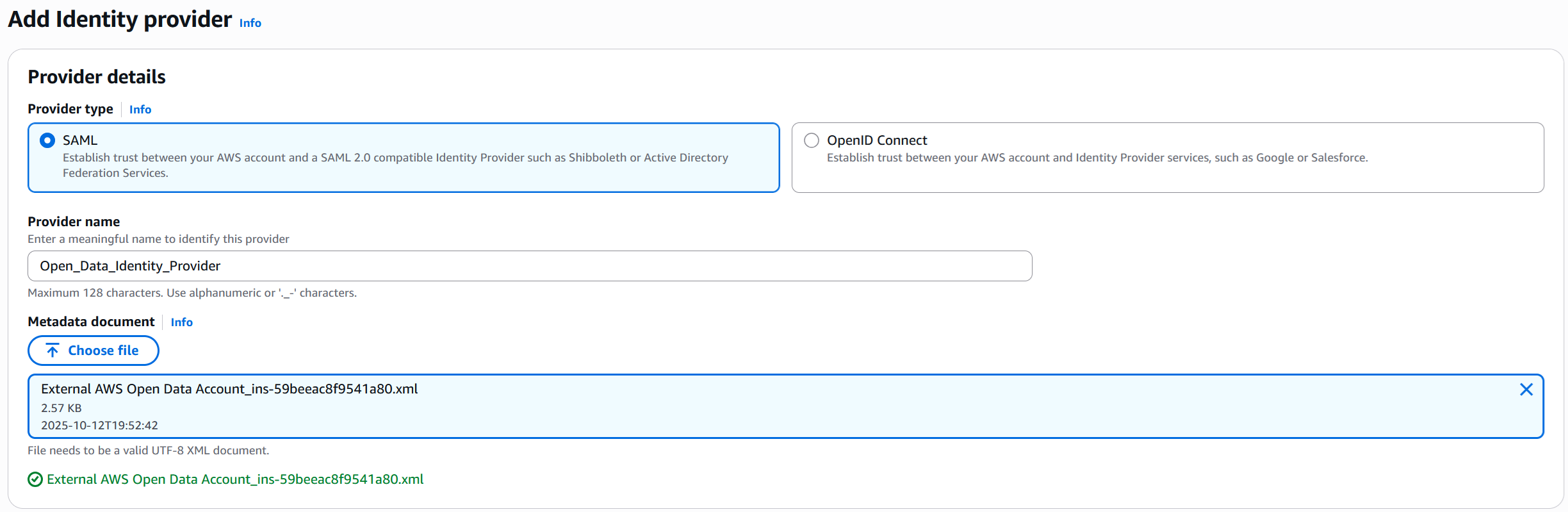 - Under Metadata document, choose Choose file and upload the IAM Identity Center SAML metadata file that you downloaded earlier.