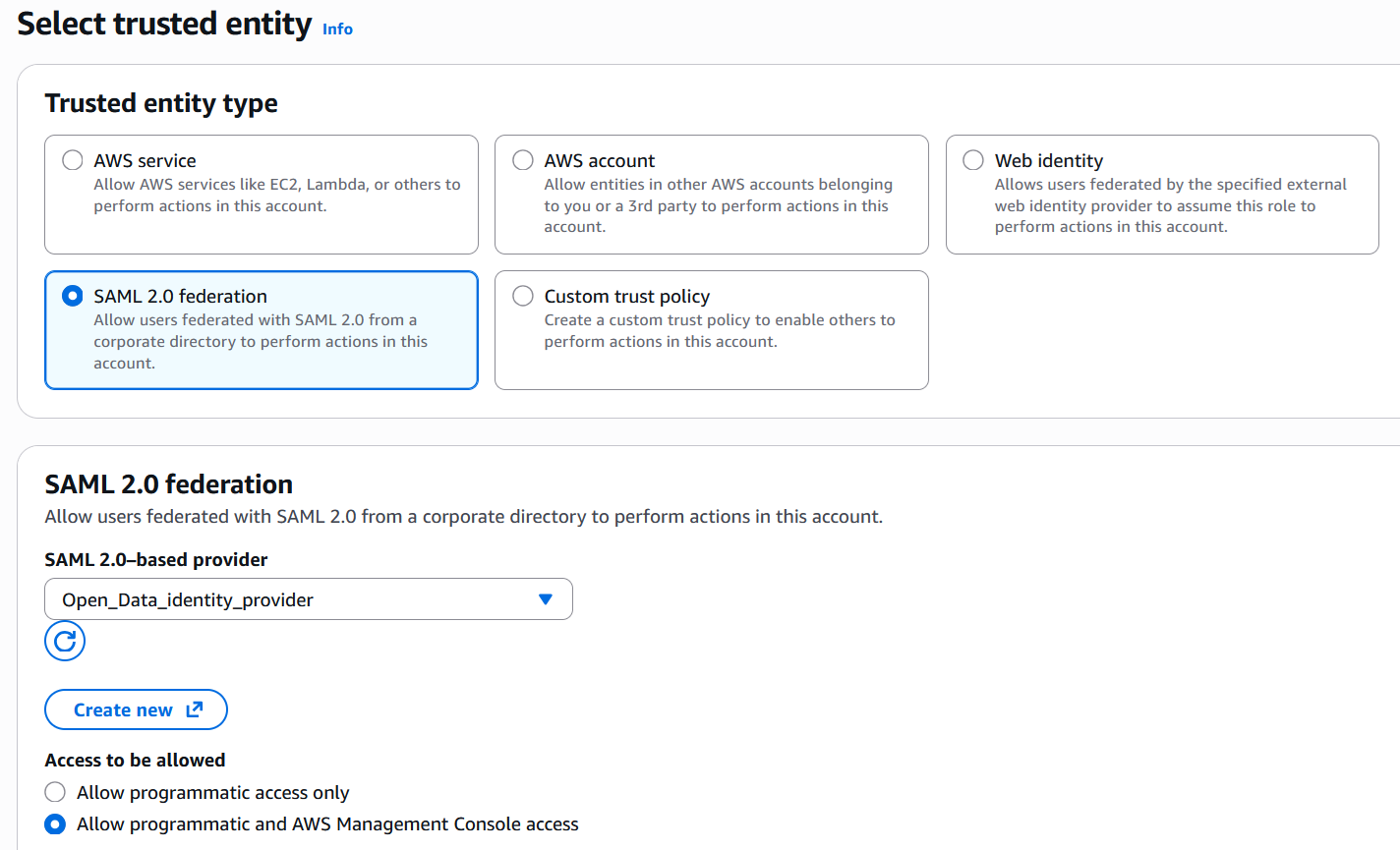 - Review the role configuration and choose Create role to finalize the SAML federation IAM role.