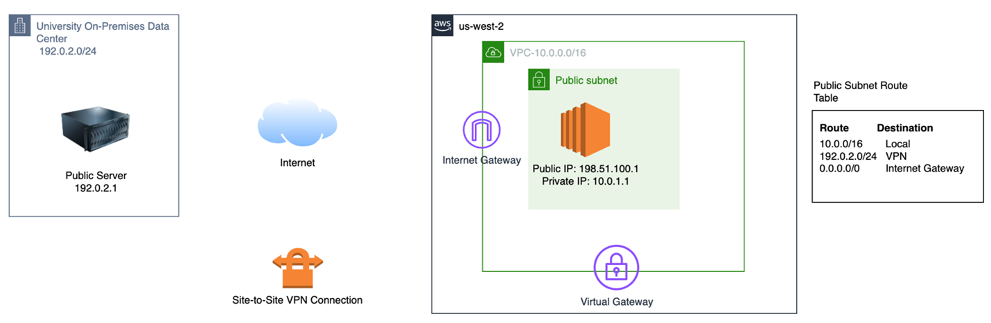 Let’s say you have a requirement to host a public Amazon Elastic Compute Cloud (Amazon EC2) web app server on AWS. This server must be capable of receiving traffic from on-premises public endpoints in the CIDR range 192.0.2.0/24 on its public IP as well as communicate with internal endpoints over the VPN in the same 192.0.2.0/24 CIDR range over its private IP.