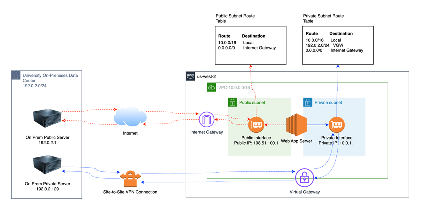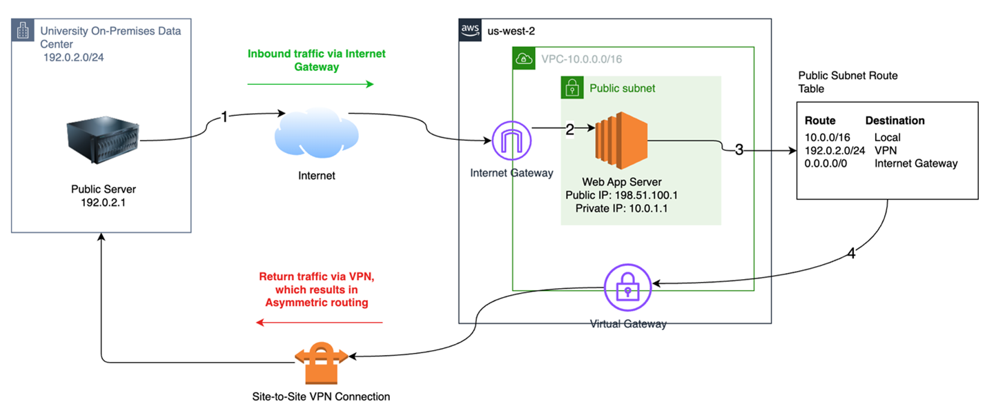 Figure 2: Flow demonstrating how inbound traffic from on-campus public IP flows in through the internet gateway, but VPN route table entries cause the return traffic to be routed over VPN. This causes asymmetric routing.