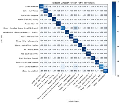 Figure 2: An initial confusion matrix showing excellent classification of 16 small mammal species from their tracks. Some of these species are indistinguishable in hand.