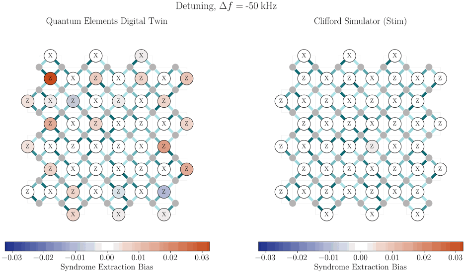 To probe how coherent control errors manifest in syndrome extraction, we sweep the gate drive frequency (detuning) away from the qubit frequency. When we sweep the detuning, the QMC digital twin reveals a frequency-dependent, spatially structured syndrome-extraction bias, directly exposing sensitivity to control-parameter miscalibration, as shown in the left plot of Figure 1. In contrast, the Pauli‑twirled Stim model predicts a largely uniform response and misses the structured, phase‑sensitive bias patterns that arise. This is because the digital twin explicitly tracks open-system dynamics, it enables richer diagnostics and reveals correlated, spatiotemporal signatures that can inform more expressive decoder design and evaluation.