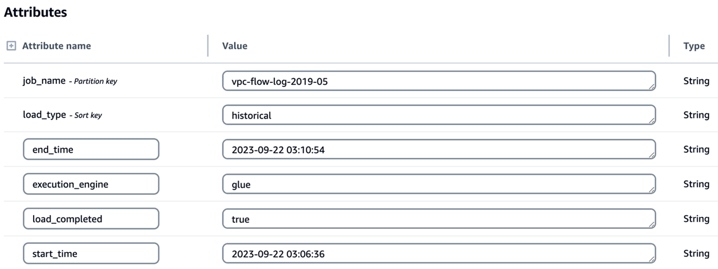 The checkpointing feature provides process resilience by tracking conversion progress in the asl-etl-framework-ocsf-run-status DynamoDB table. If a conversion process fails during multi-year historical processing, the solution resumes from the point of failure rather than reprocessing previously converted data. For example, if conversion fails while processing the second year’s data, the solution will resume from that point, preserving the first year’s successful conversion. While this feature is enabled by default, you can disable it, in which case any process restart will begin from the initial specified date. The following image shows the load_type as historical along with start_time and end_time for the period you want to transform the logs.