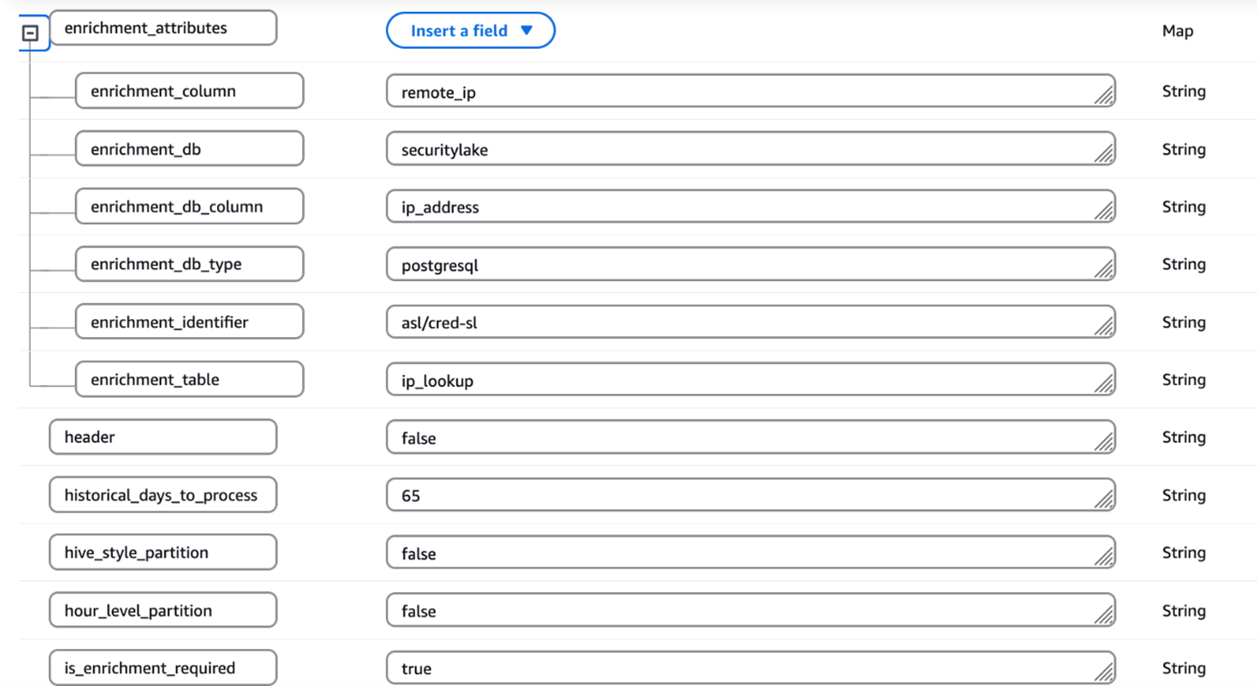 Enterprises often possess valuable contextual data that can enhance their security logs through enrichment. By correlating existing data with security logs and appending relevant information, you can create more comprehensive datasets for advanced analytics and deeper security insights. After the logs are converted to OCSF, you might want to know more about specific columns or attributes so that you can extract meaningful information. To support this, the solution has an option for enrichment. For example, if you want to get additional information, such as the geolocation of each IP address in the logs, you can provide the source database information in the metadata CSV file of the solution. It connects to the source database through a JDBC connection, extracts the requested information associated with the IP address to enrich the dataset, and adds the extracted information as new columns to the converted OCSF log output. In this way, you can have detailed information about each IP address in the converted OCSF log. The following screenshot shows parameters for enabling enrichment by setting the is_enrichment_required flag as true and adding necessary enrichment_attributes to the metadata table.