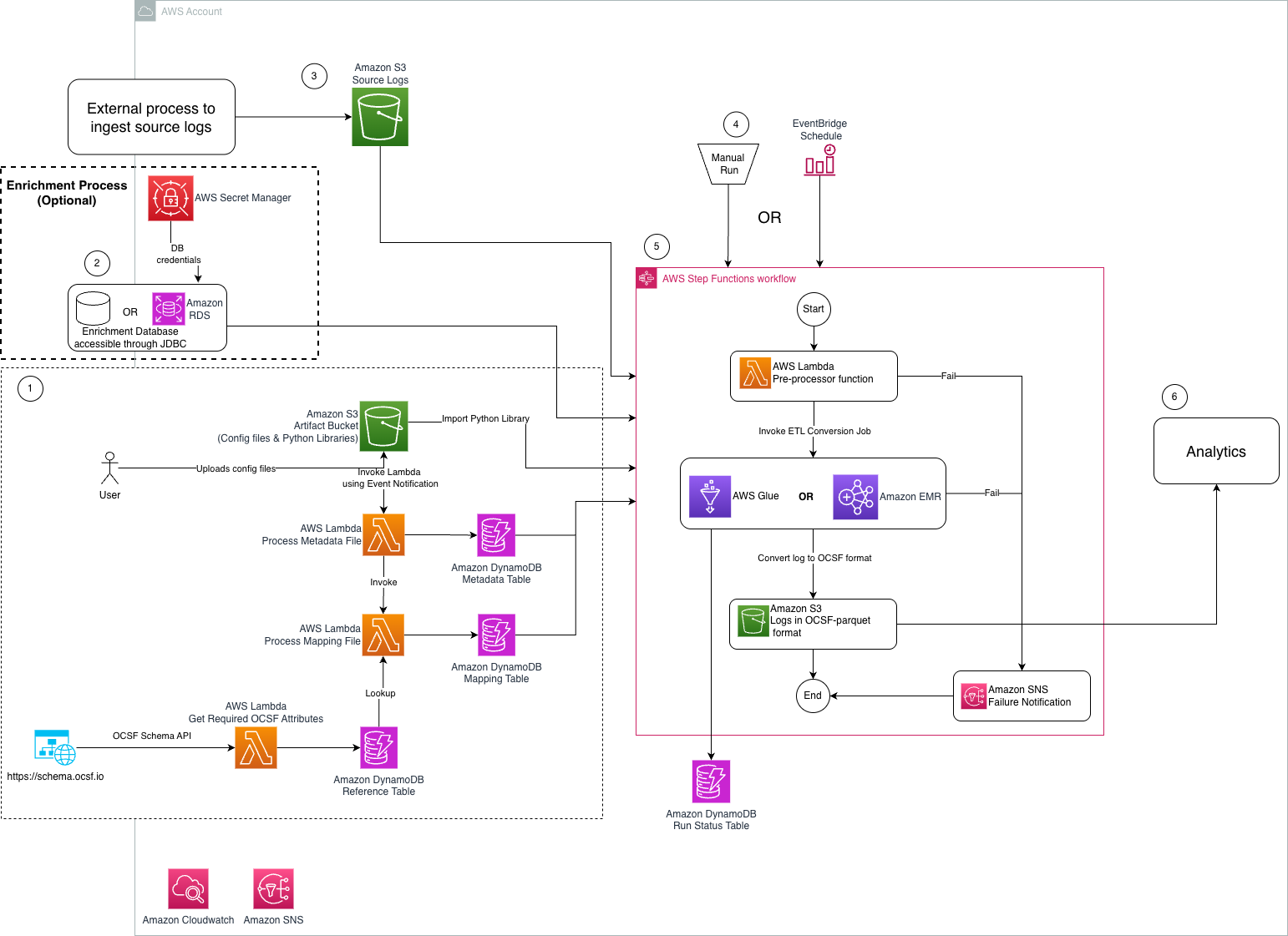 - An Amazon S3 artifact bucket stores the metadata, source-to-target mapping, and Python libraries required for OCSF conversion.