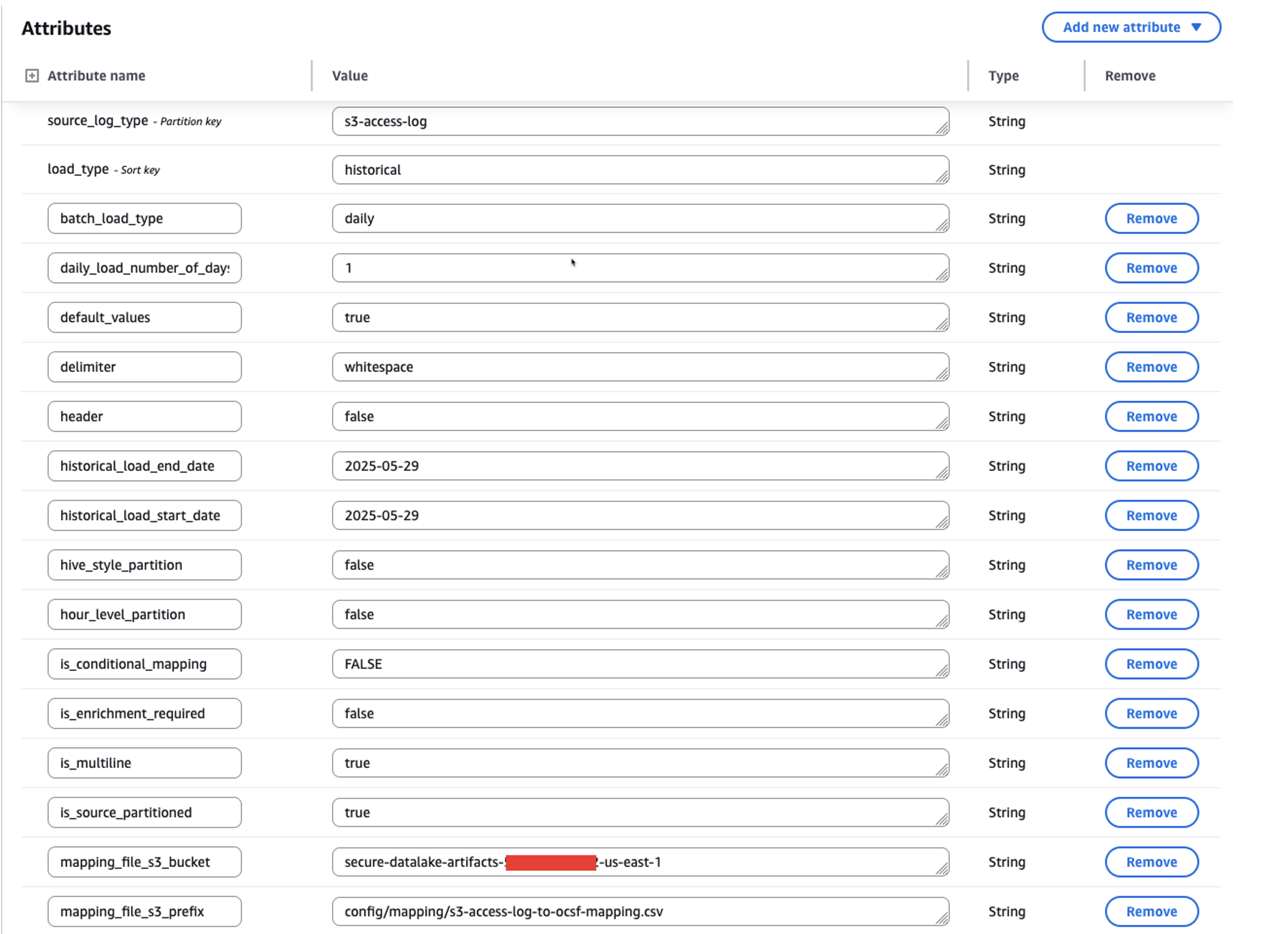 Figure 4: Screenshot of configuration for historical load attributes in the asl-etl-framework-source-ocsf-metadata DynamoDB table