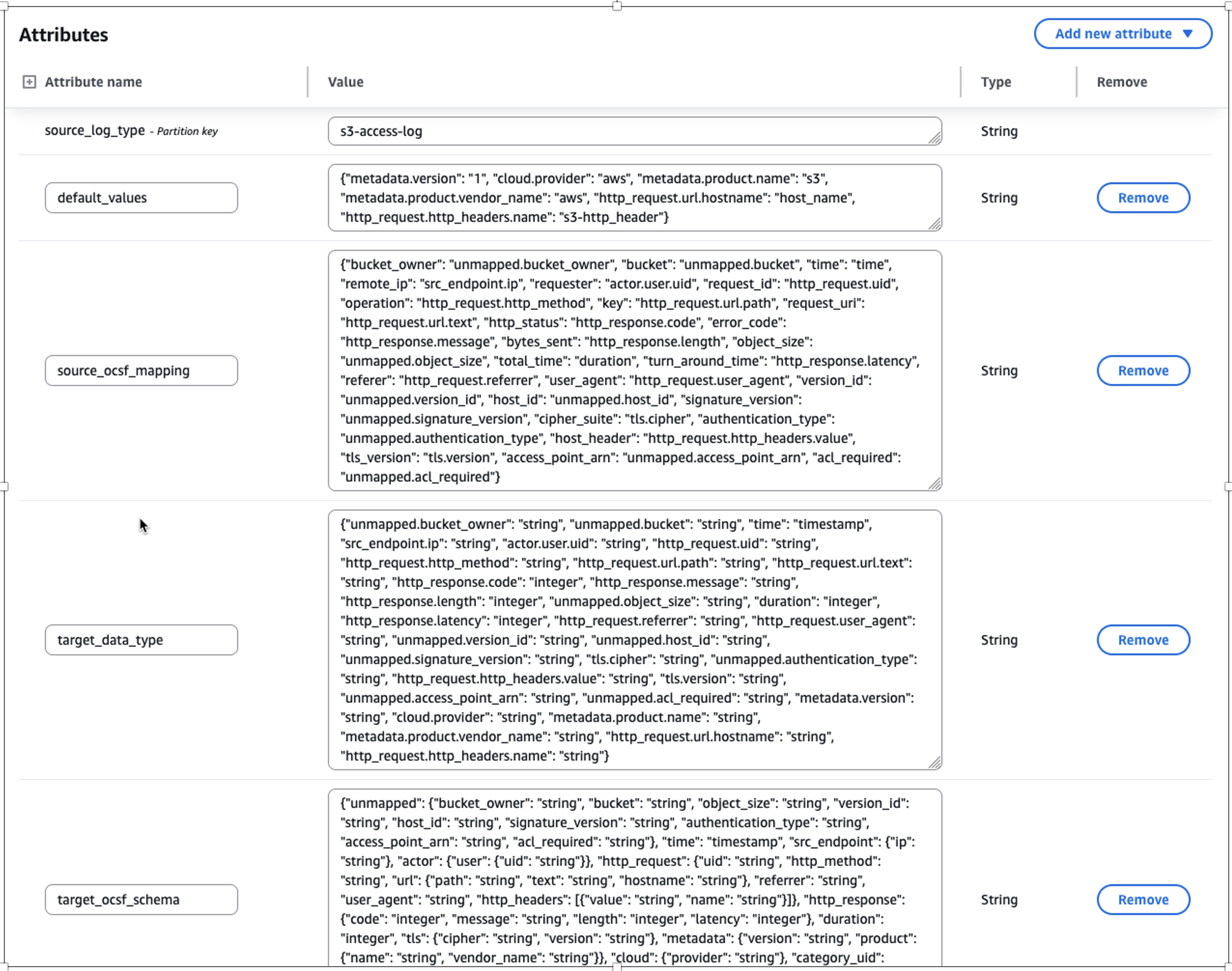 Figure 3: Screenshot of transformed mapping in the asl-etl-framework-ocsf-attribute-mapping DynamoDB table for S3 Access Logs