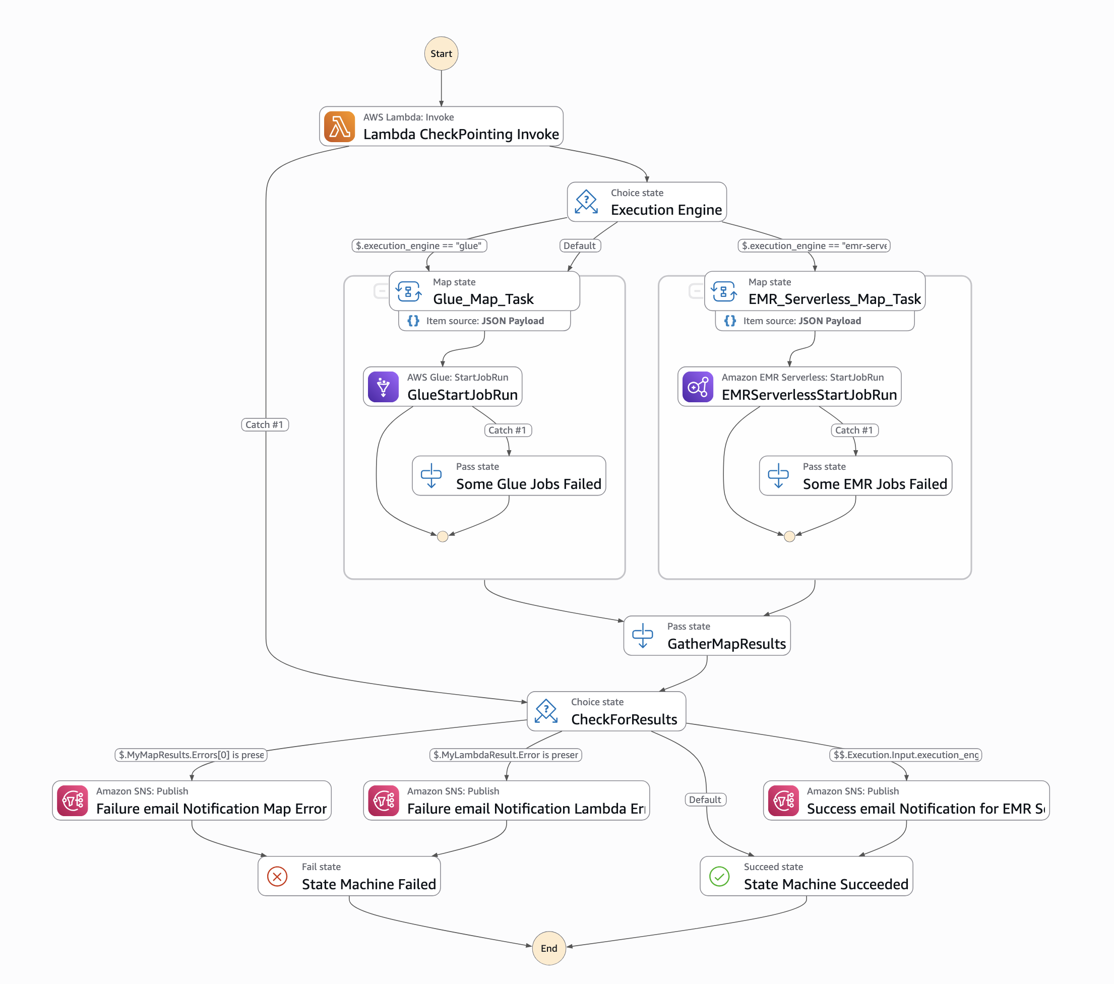- An Amazon SNS topic is used to notify users if the Step Functions workflow fails during checkpointing or the ETL process.