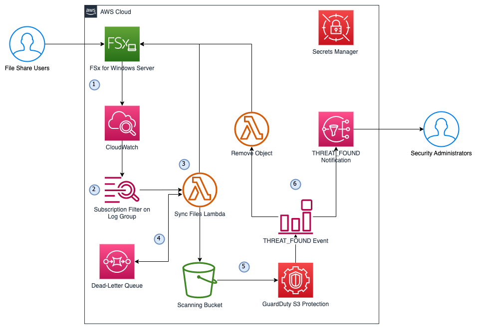In this blog post, we’ll introduce a modern, serverless approach to implementing automated malware scanning for FSx for Windows. Our solution eliminates the need to manage EC2 instances while providing robust protection for your file shares. By leveraging AWS serverless services, we’ve created a scalable, cost effective scanning mechanism that helps protect your data from malicious content. This solution provides additional security controls that can help strengthen your FSx for Windows deployment’s security posture while minimizing operational overhead. Organizations can use it as part of their strategy for protecting sensitive data, supporting compliance requirements, and implementing security best practices.