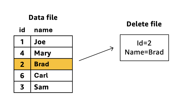 For the above diagram example, during query time, Iceberg dynamically applies the delete file’s predicates to the data file. The row with id=2 and name=Brad remains in storage but becomes invisible to queries. Iceberg “merges” the delete information during read operations without modifying the original data files. If compaction runs against these two files, it would: