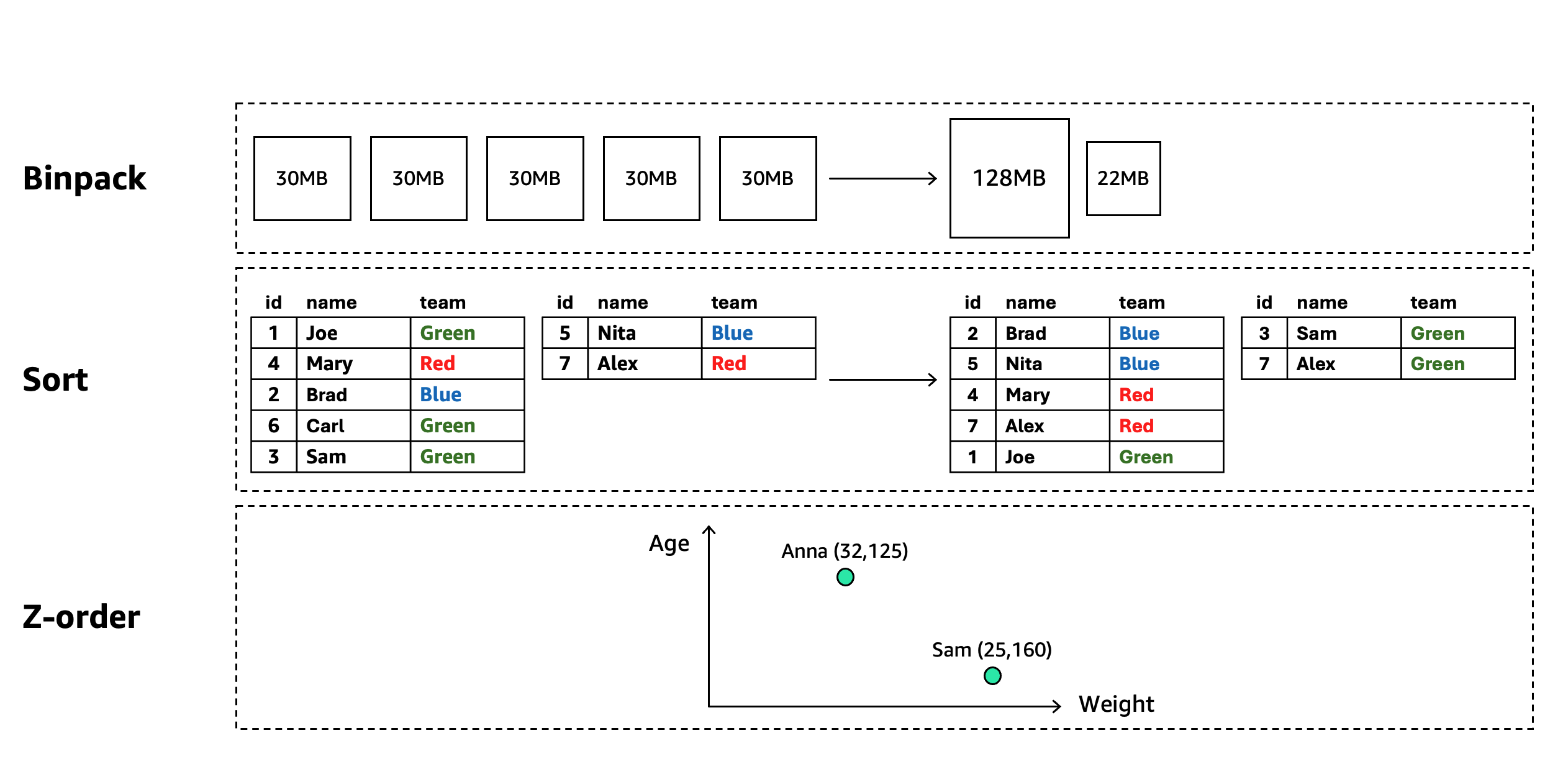 - Compaction (Binpack, Sort, Z-order) – Create larger, more efficient files by consolidating smaller ones, potentially reordering data using sort or z-order techniques to enable faster and more cost-efficient queries, or merge delete files with data files