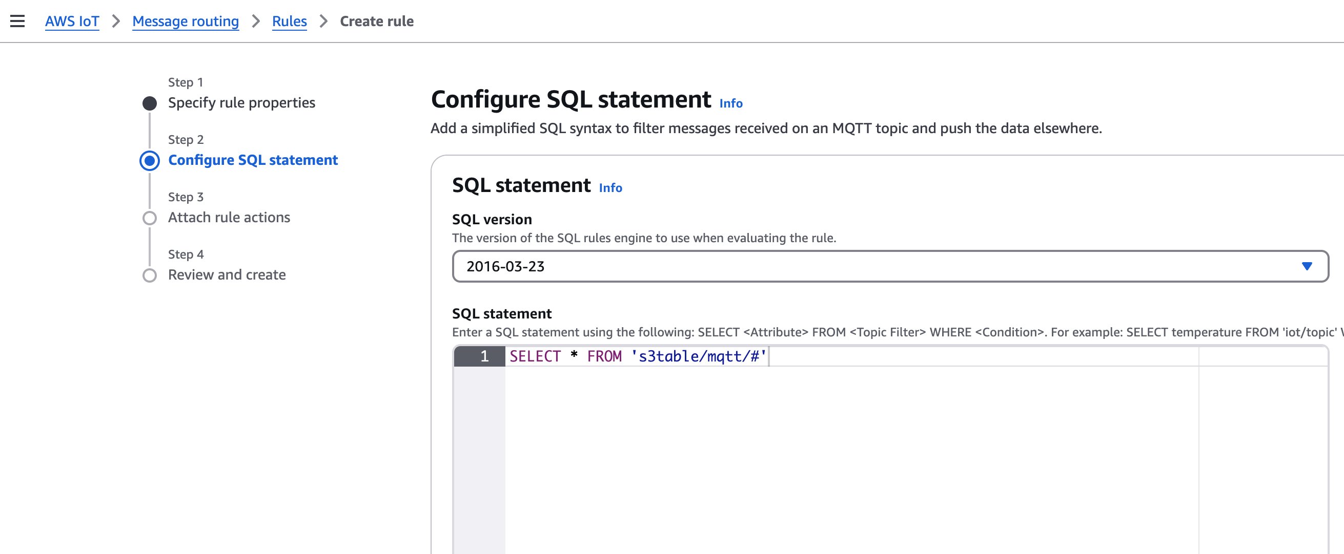 SQL statement: SELECT * FROM 's3table/mqtt/#'