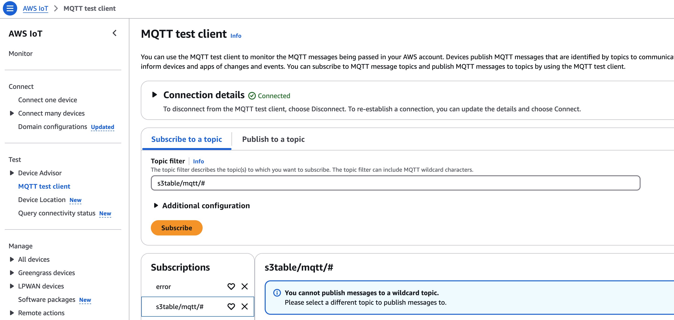 Open MQTT test client on the AWS IoT Core console. Fill the Topic filter of Subscribe to the topic s3table/mqtt/# and error. Choose Subscribe. You should see these two topics under Subscriptions, as shown in the following figure.