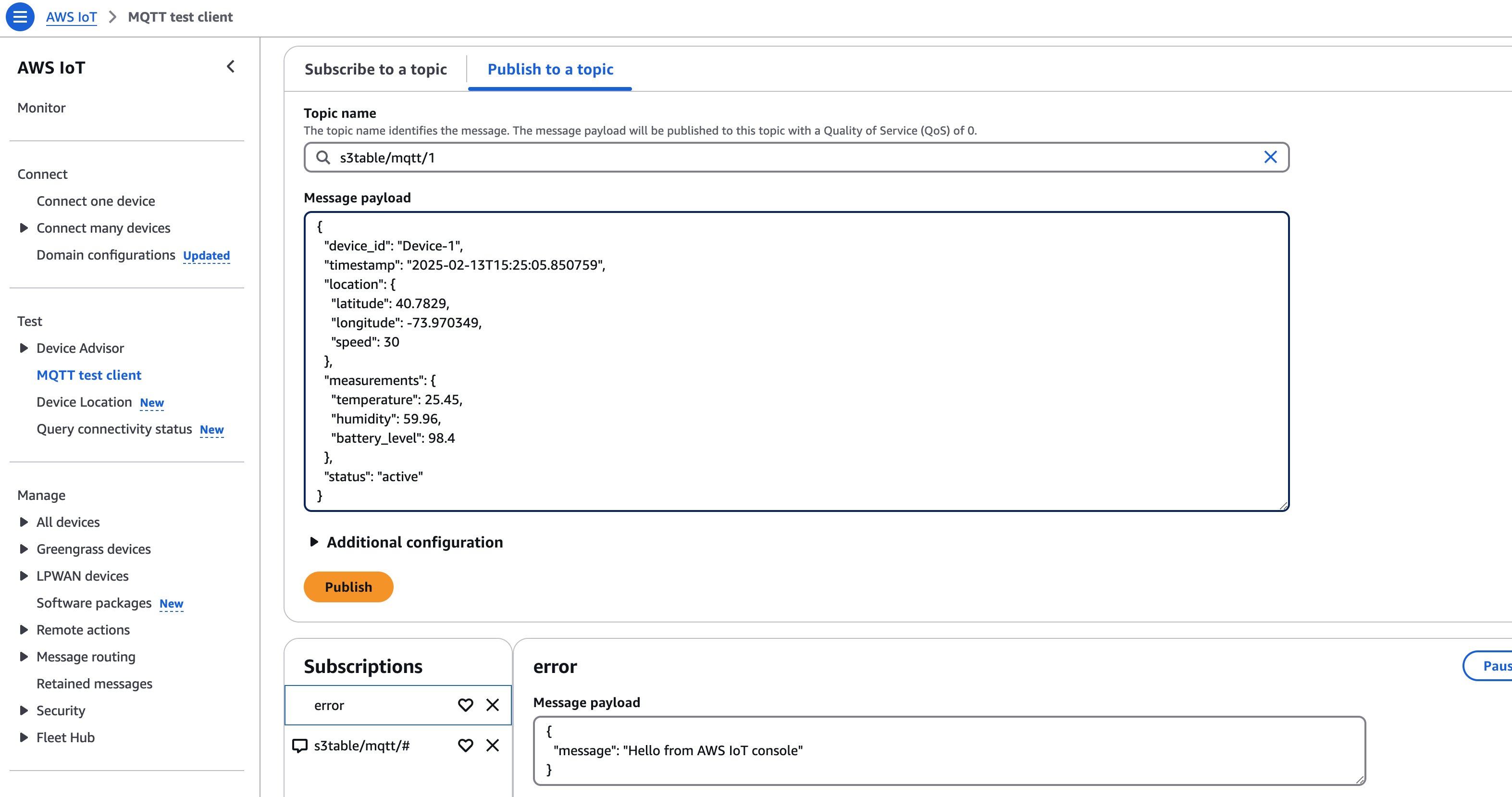 Remain on the MQTT test client console, and choose Publish to a topic. Set the Topic name as “s3table/mqtt/1”. Replace the Message payload with the following JSON message: