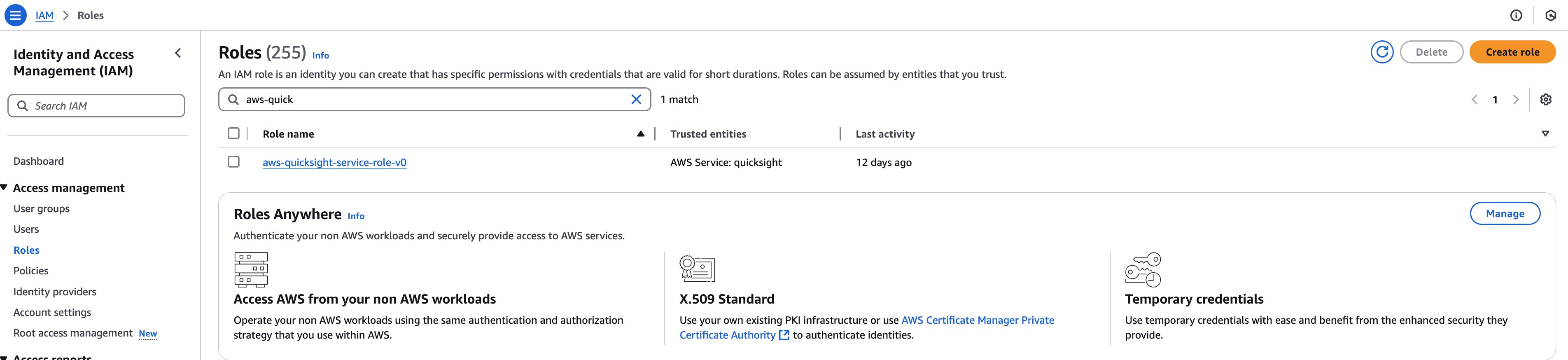 A. Open the IAM roles console. Search for the role named “aws-quicksight-service-role-xx”. Choose that auto-generated role.