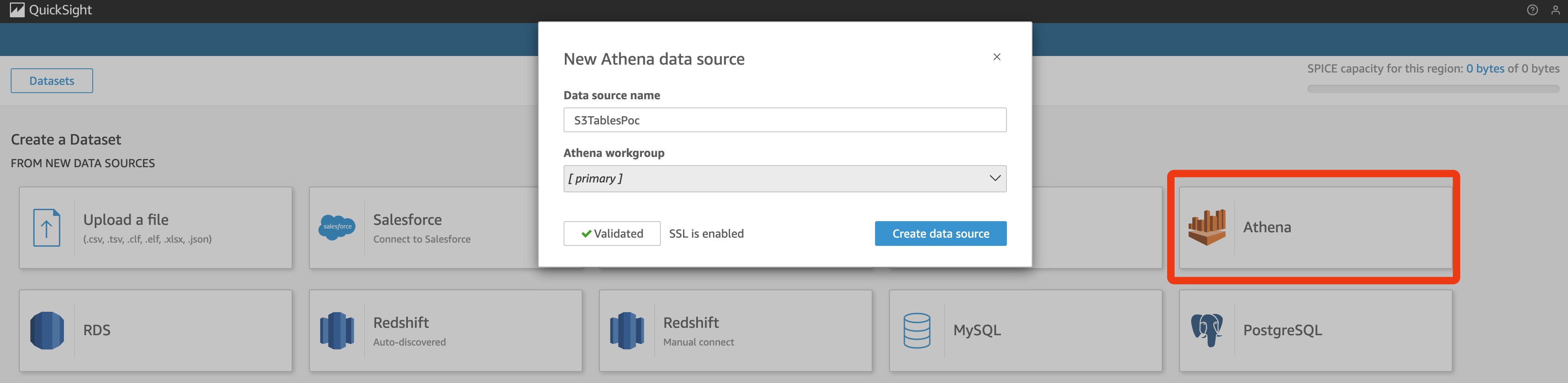Enter a name for Data source name, for example “S3TablesPoc”. Choose [primary] for the Athena workgroup. Then, choose Create data source.