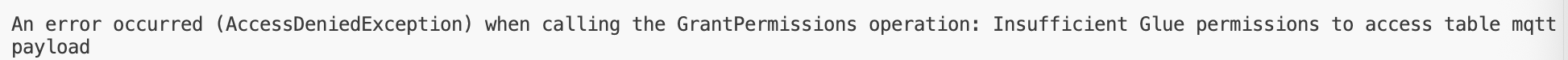 If you received AccessDeniedException like the following, then add your IAM role or IAM user as Data lake administrators on the Lake Formation console.