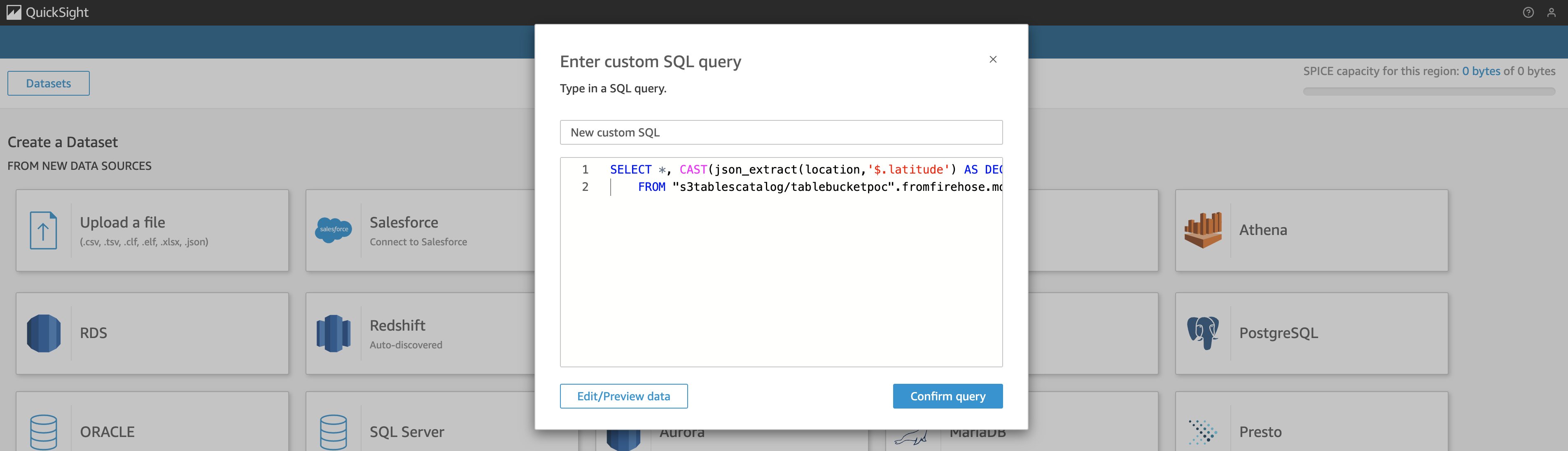 D. Choose Use custom SQL. Paste the following SQL query, and choose Confirm query.