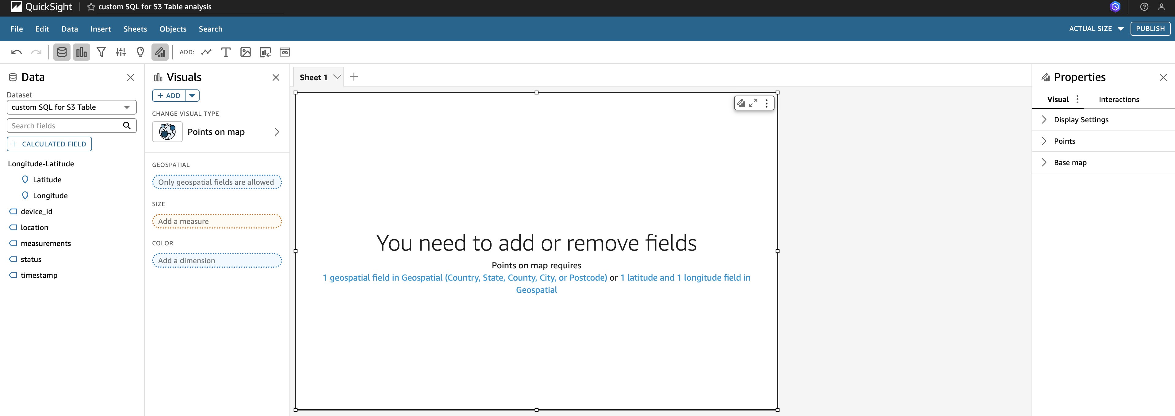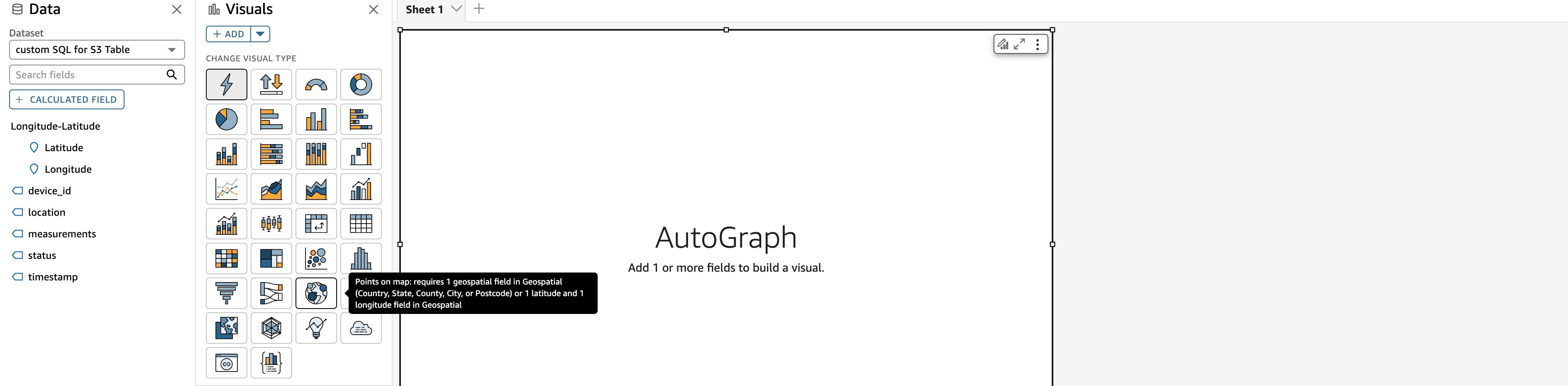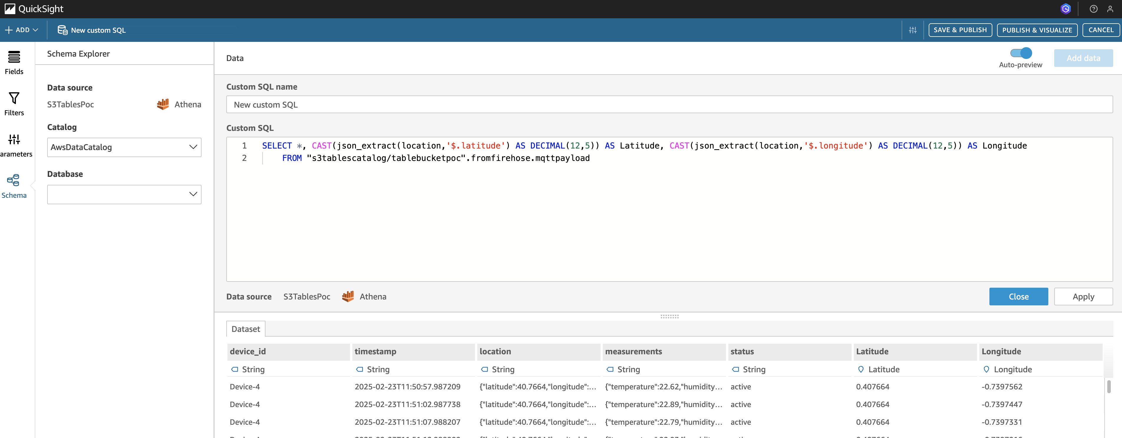 The console jumps to the Schema Explorer of Quick Sight. You can already see the query results with latitude and longitude values, as shown in the following figure: