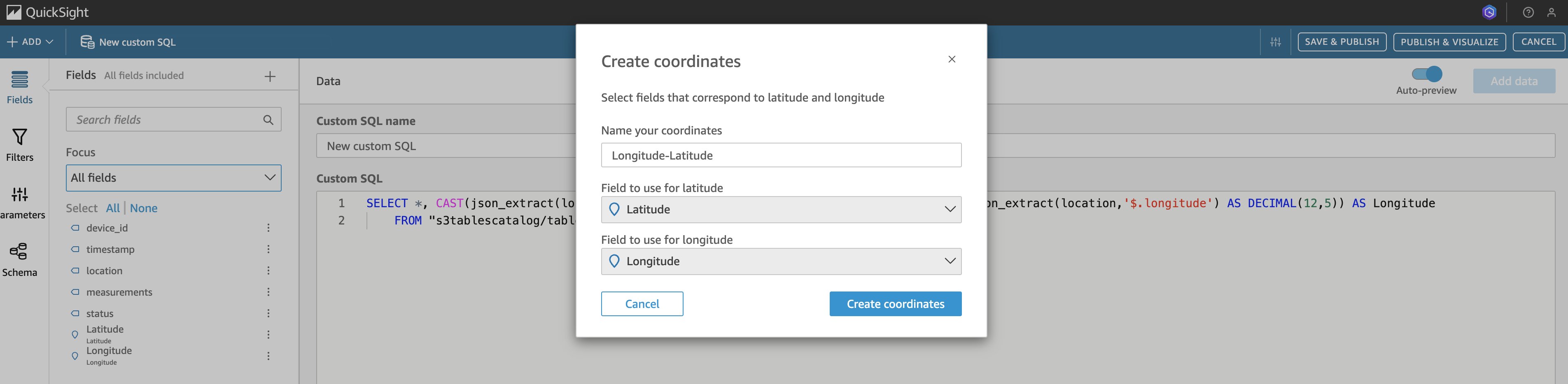 F. Choose Fields on the left panel. You can see the field list. Choose the extension button (the three dots) beside Latitude, then choose Add to coordinates, as shown in the following figure.