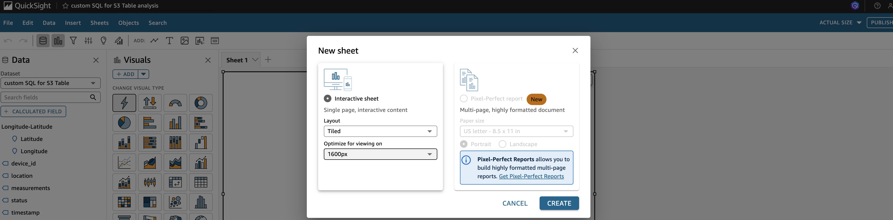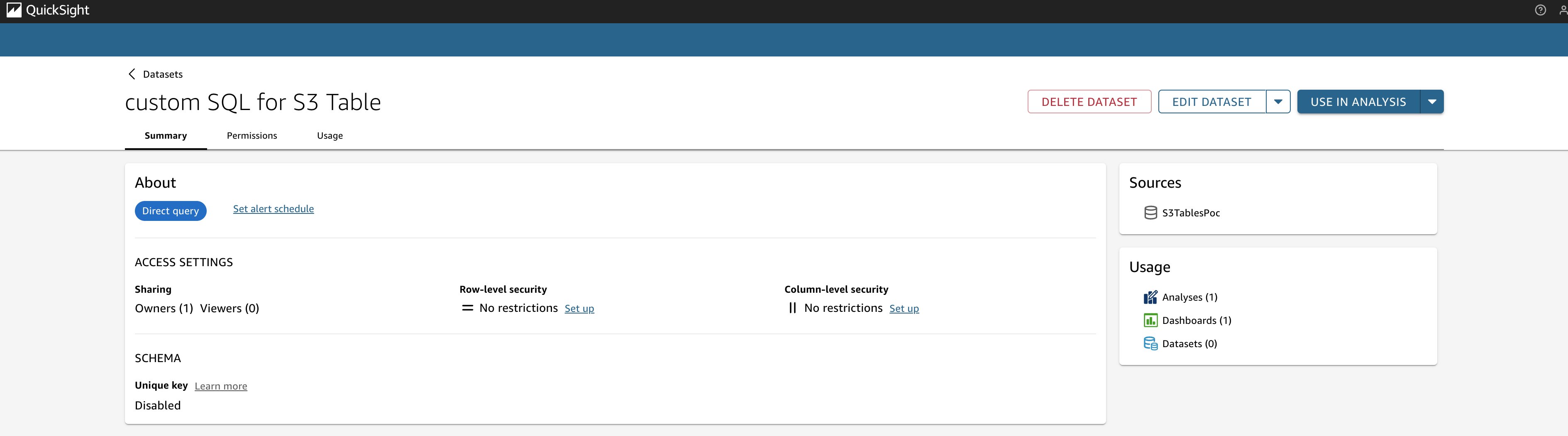 A. Go to the Analyses section of the Quick Sight console. Choose New analysis on the top right. Choose your dataset custom SQL for S3 Table. Choose USE IN ANALYSIS.