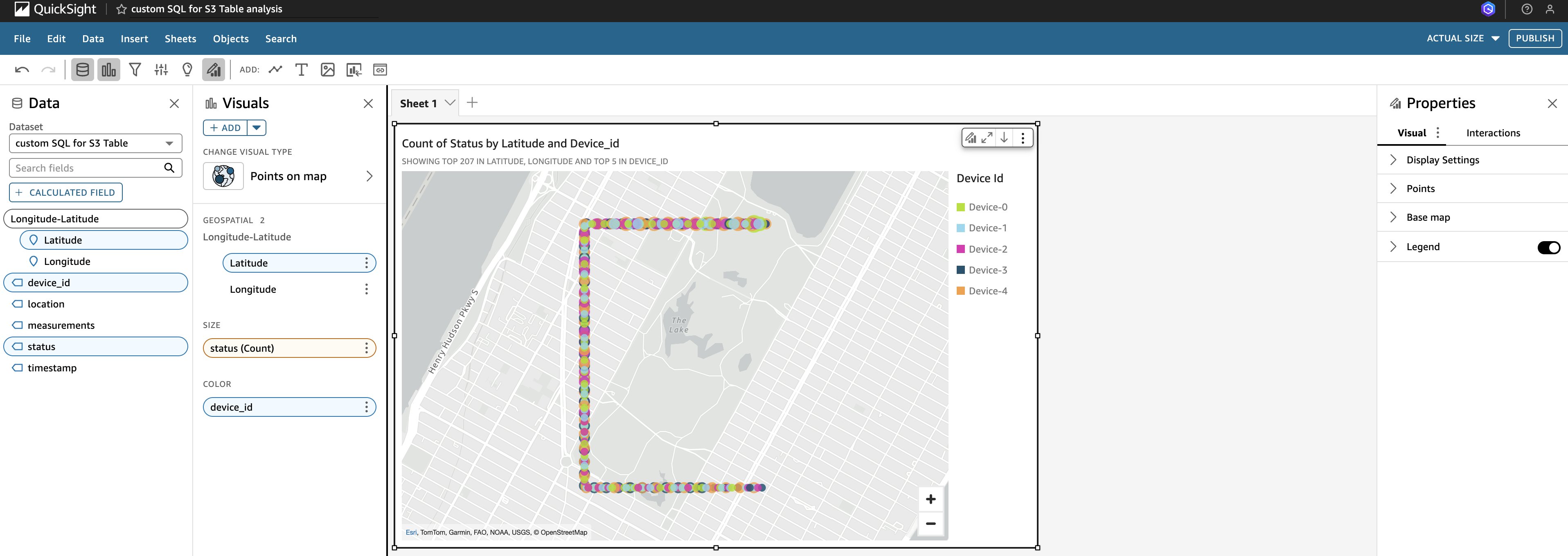Drag the field Longitude-Latitude into GEOSPATIAL – Only geospatial fields are allowed. Drag status into SIZE – Add a measure. Drag device_id into COLOR – Add a dimension. Then the map with data points should show up as shown in the following figure.