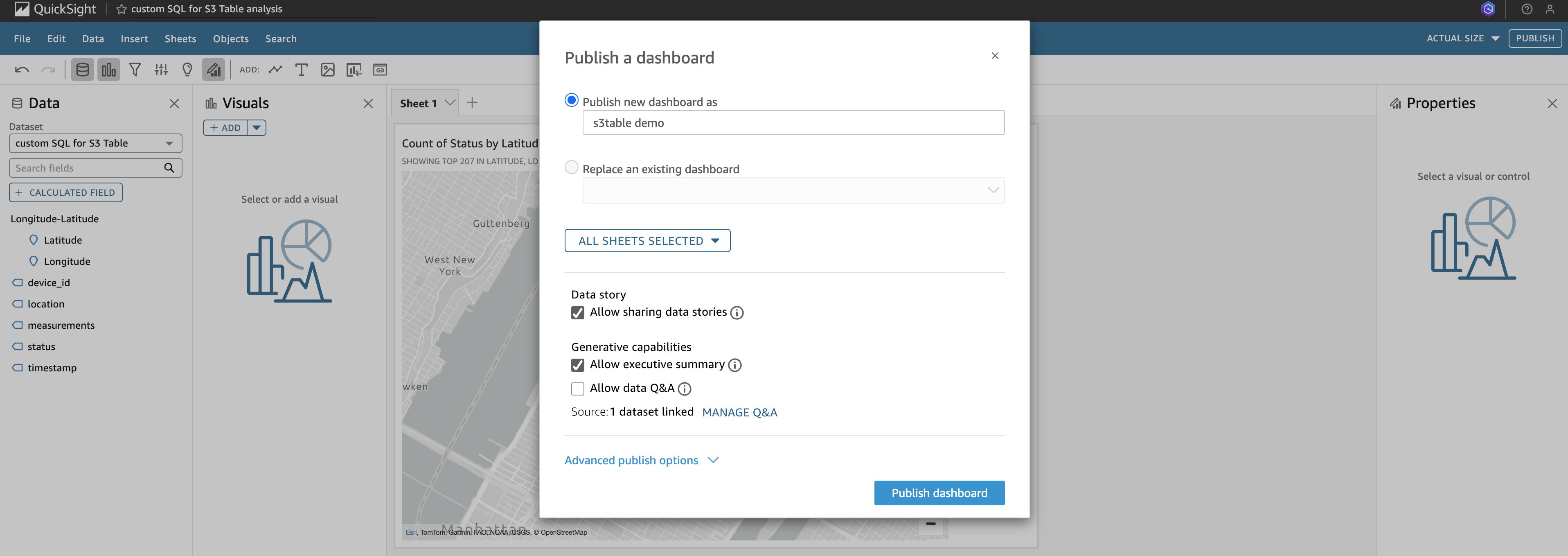 D. Choose PUBLISH on the top right of the console. Enter a name for the new dashboard, for example “s3table demo”. Then choose Publish dashboard.