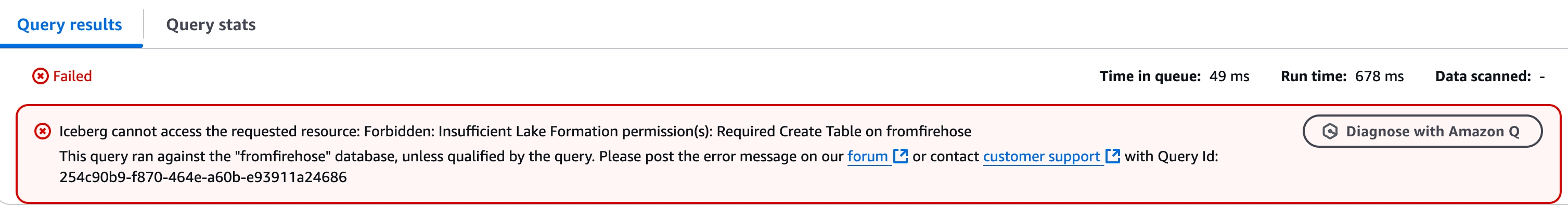 If the Athena console throws the following error, then confirm your configuration according to the section “Step 3 Grant permission for Admin role (optional)”.